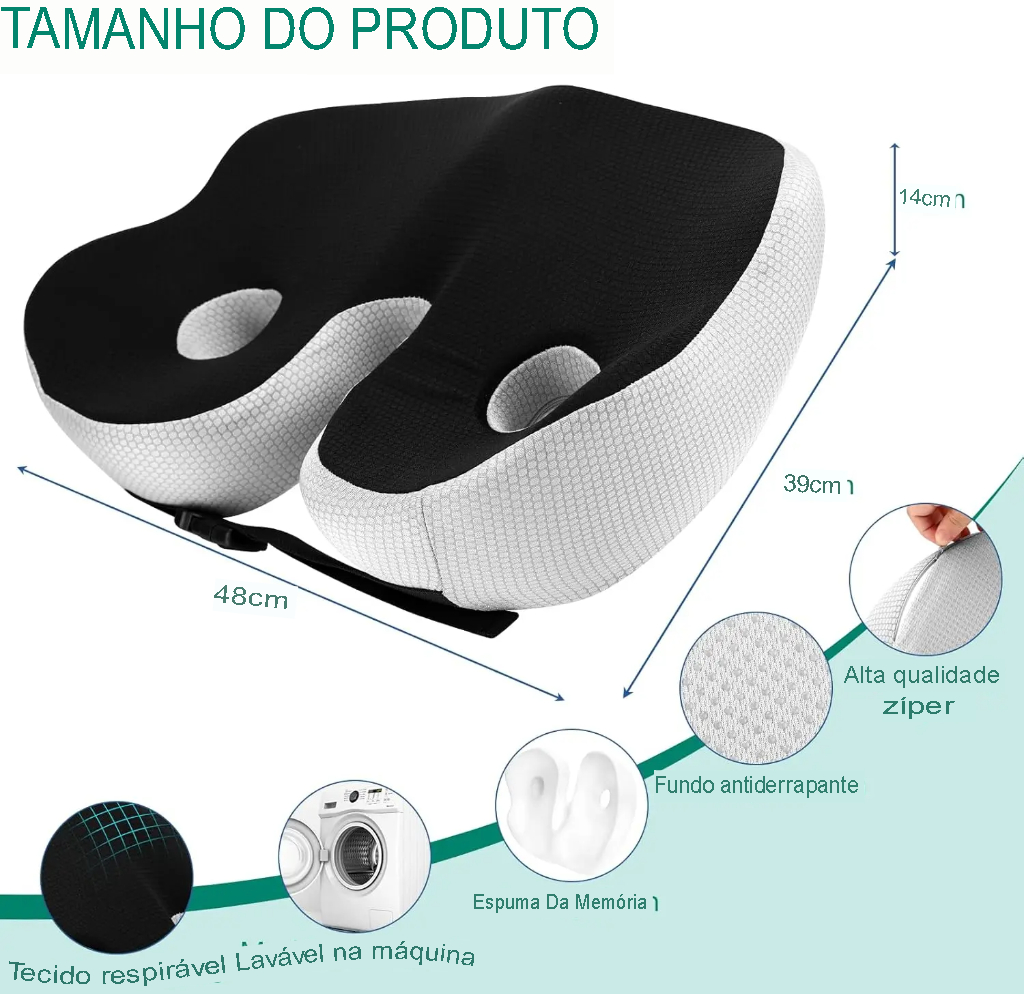 A almofada foi criada para oferecer suporte ergonômico e conforto contínuo durante longos períodos sentado. A espuma de memória molda-se ao corpo, reduzindo pressão nas costas e quadris, enquanto o tecido em poliéster garante toque suave e fácil manutenção. Ideal para uso em casa, escritório ou carro.
