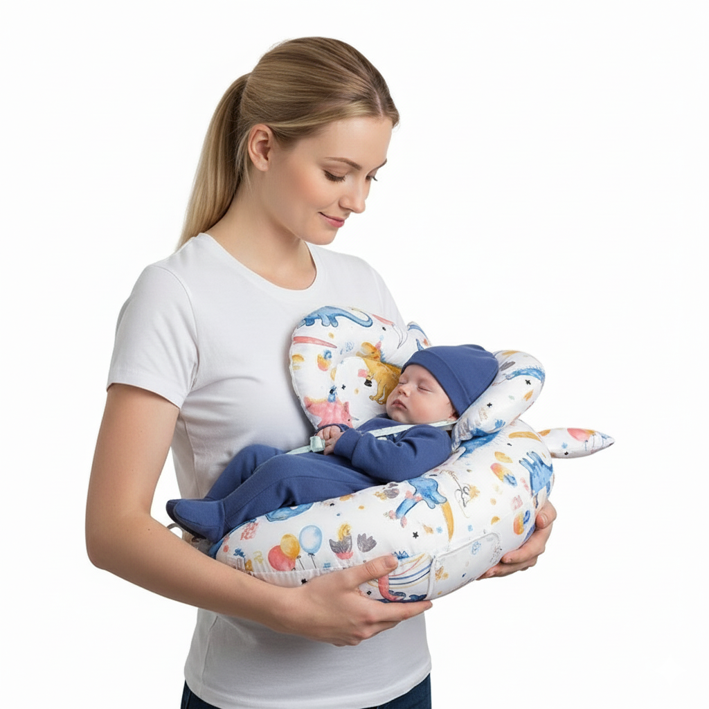 O travesseiro foi criado para proporcionar suporte ergonômico à mãe e ao bebê durante a amamentação. Seu design multifuncional oferece apoio para lombar e cintura, enquanto o material em algodão garante toque suave e respirável. Ideal para uso diário, promovendo conforto contínuo para mamãe e bebê.